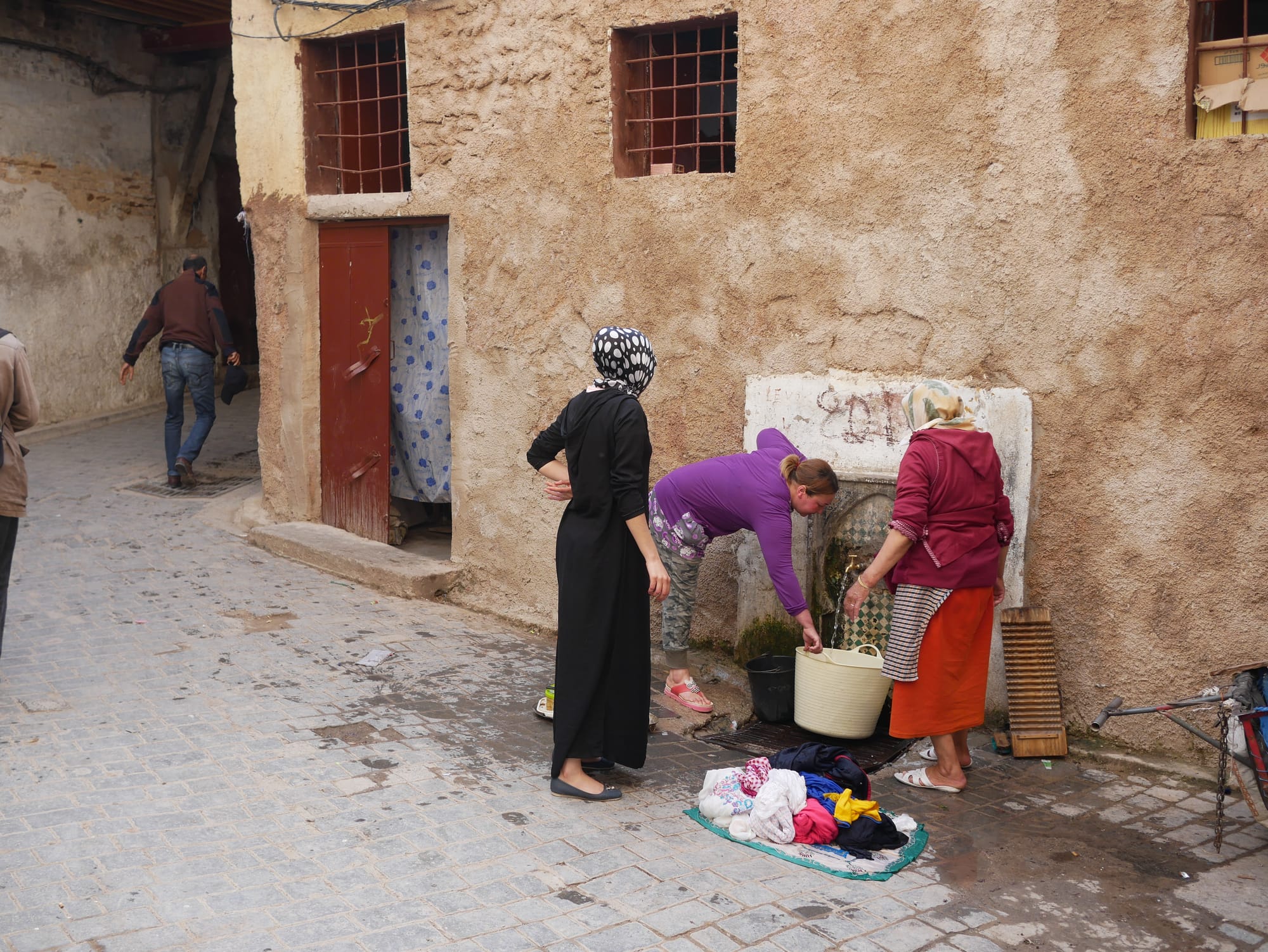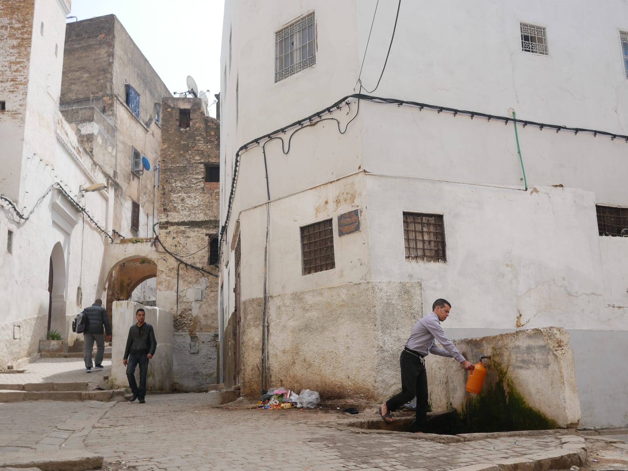 När Fèz stadskärna växte blev det hydrauliska system allt med komplext. Idag rinner det fram vatten överallt. Det privata vattnet anar man bakom murar där fruktträd syns. När vattnet leds in på gårdarna passerar de nästan alltid en fontän i trädgården innan de tar sig in i köket och badet genom rör. Vatten får visa upp sig innan det gör nytta. Vi tycker om att se det göra sina konster.