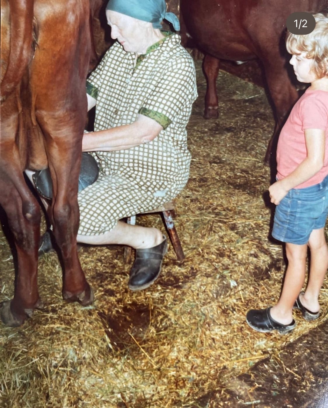 Jag har bilder från när jag sitter intill min farmors syster och hon mjölkar en ko för hand. Vi har likadana träskor. Det fanns där, man behövde bara sträcka ut handen för att röra vid det.
