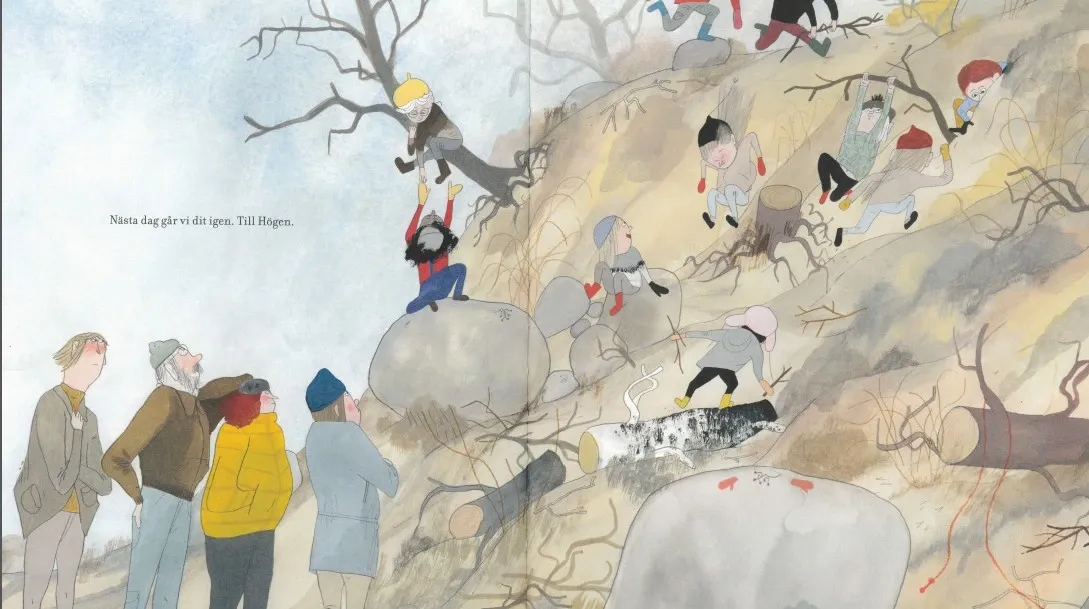 Och det är också vad barnen gör i boken. De fortsätter kräva världen. De hittar Högen, ”ett berg av lite blandat”. De vuxna kan bara stå där och se det hända.