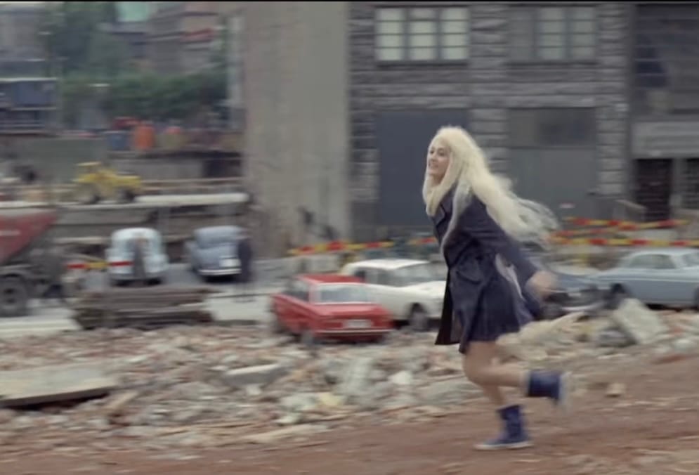 I en lång scen går hon omkring på Norrmalm, bland rivningstomterna och letar adressen till Bert, som visar sig ha flyttat till Transistorvägen. Hennes energirika utanförskap är en mer drabbande skildring av den gamla stadens försvinnandet än de flesta andra dystopiska varianter. Känslan av att platsen när som helst kan slå klorna i henne. Hon är sårbar men inte rädd.