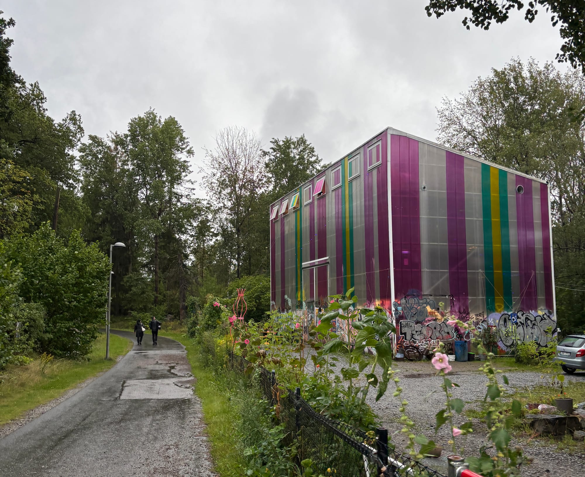På vägen till Snösätra, från Högdalen, gick vi förbi kulturhuset Cyklopen, som en färgglad lykta i skogskanten. Cyklopen är "ett självförvaltat och frihetligt kulturhus i Högdalen för folkbildning, musik, scen-, litterär- och ljudkonst, hantverk, odling, självorganisering och gemenskap".